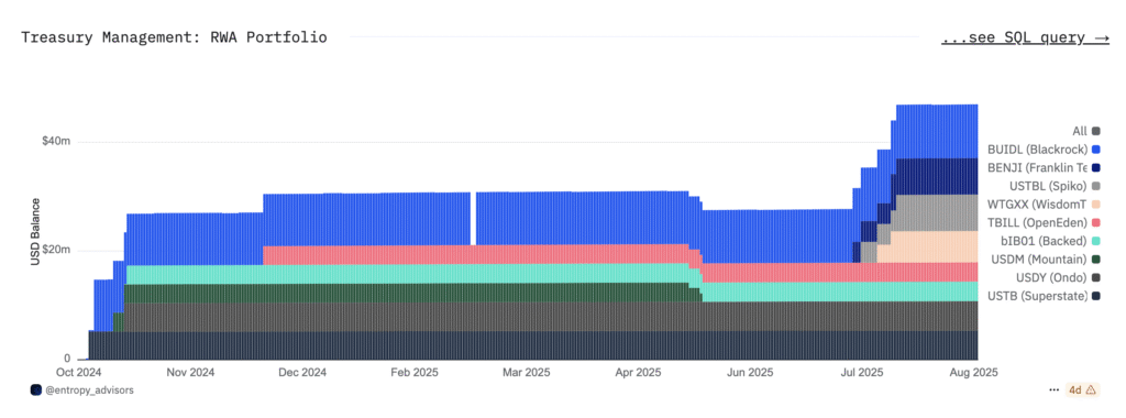 Peki, Arbitrum hazinesinin de RWA varlıkları tuttuğunu biliyor muydunuz? Mevcut durumda Arbitrum hazinesi $47 milyon dolara yakın RWA varlıkları tutuyor. Bunlar sırasıyla, $BUIDL, $BENJI, $USTBL, $WTGXX, $TBILL, $bIB01, $USDM, $USDY ve $USTB. Dağılımlarını aşağıdaki grafikte görebilirsiniz.